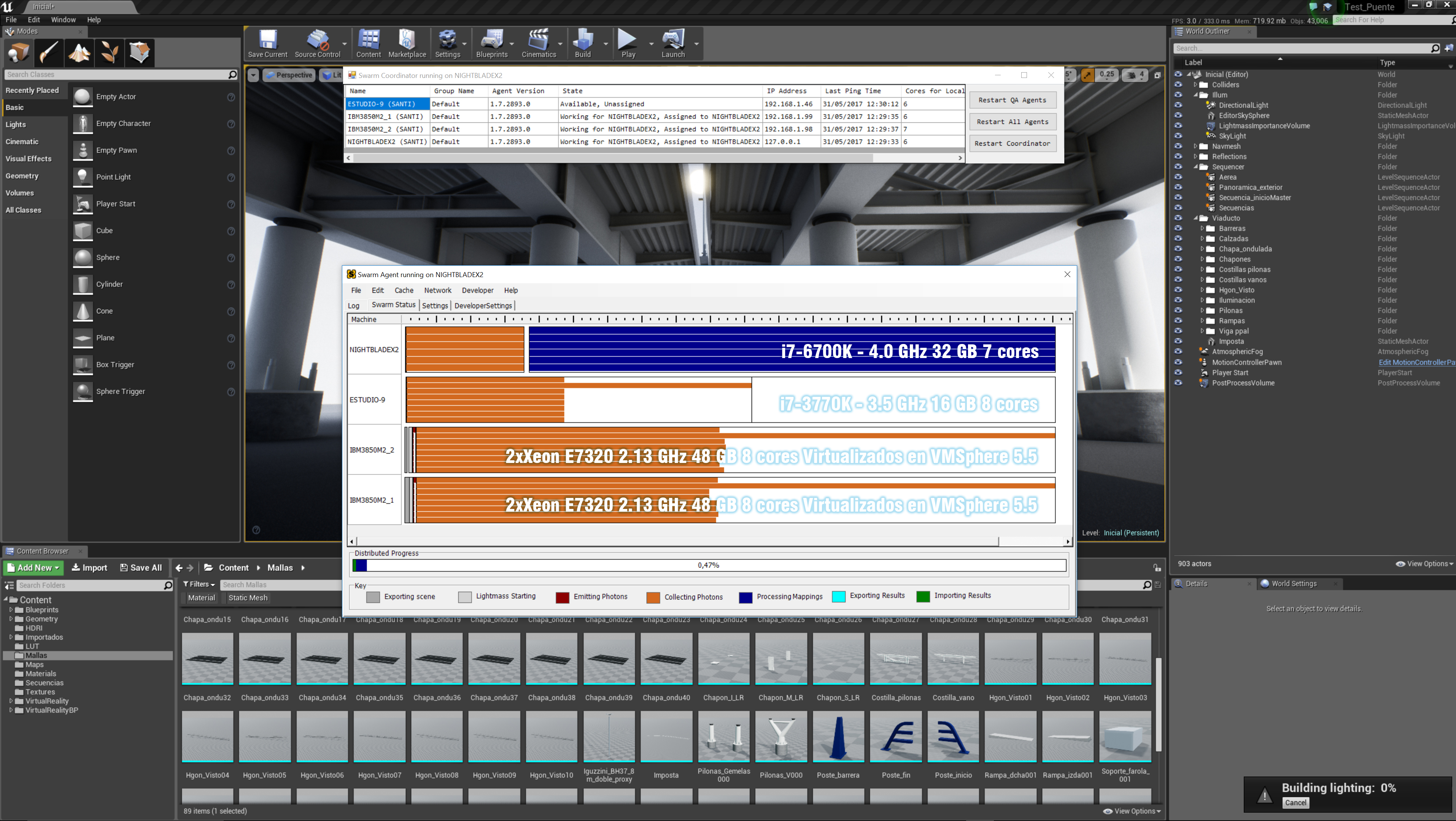 Fig. 1: máquinas reales vs. máquinas virtuales peleando en un cálculo de lightmassing para una evaluación de un viaducto en fase de diseño para VR. Cada línea es un core, líneas cortas, proceso terminado antes, líneas largas, proceso de mayor duración o incluso sin acabar.