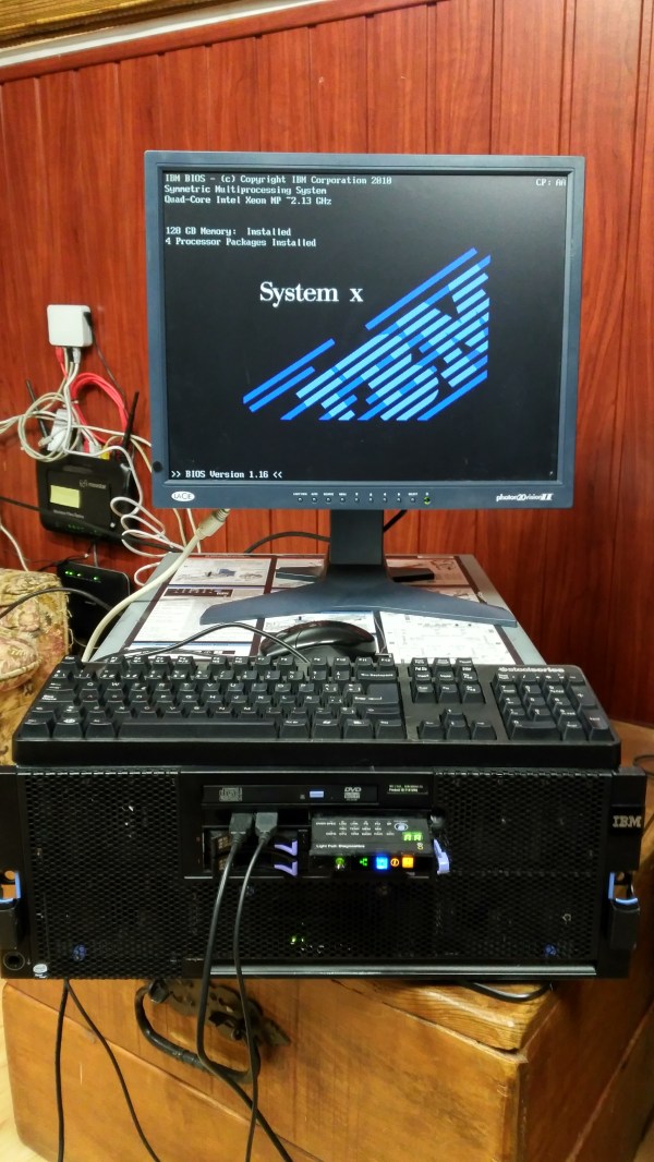 Me hacía especial ilusión que un IBM genuino volviera a entrar en mi vida. Aprendí a programar en los tiempos de los IBM PC y XT con pantallas de fósforo verde y cariñosas impresoras matriciales. Las características de este equipo hacían que aceptara la oferta de probarlo para cálculos que no tienen en principio nada que ver con los que llevaron a crearlo: 4 Xeon relativamente viejos (2010) que suman 16 núcleos y 128 GB de RAM. Puesto que un Windows normal sólo acepta 2 procesadores físicos, había que elegir entre Windows Server, Linux o algo para mí desconocido hasta entonces que es VMware ESXi. Opté por este último porque en su versión 5.5 es de libre disposición, muy contenido en su instalación, muy de pantalla de fósforo verde, es decir, textos y nada de interface gráfica y con un parque instalado suficientemente garantista.